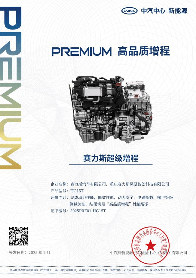 行业地位的认可来自多方权威认证。2024年12月,赛力斯超级增程系统亮相央视财经《新质生产力中国心特别节目》,2025年相继获得中国汽研"乘用车增程器综合性能之星"001号证书和中汽中心"Premium Drive高品质增程"认证。在标准制定领域,该企业联合20余家行业伙伴修订《电动汽车用增程器技术条件》,推动增程技术向规范化、标准化方向发展。