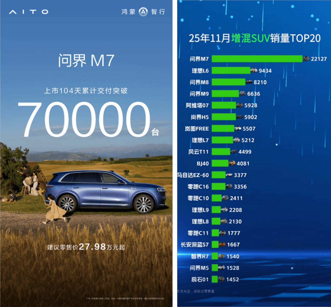 问界M7系列车型的市场表现尤为亮眼。全新M7增程版上市72天即斩获10万台大定订单,104天交付量突破7万台,全年累计交付超37万台。在2025年11月的增混SUV销量榜中,该车型以单月2.2万台的销量登顶榜首。其市场竞争力不仅体现在销量数据上,更通过权威测试得到验证——在中汽中心冬季测试中,该车顺利通过纯电续航、馈电油耗、雪地操控等全部项目,荣获"综合性能类验证"和"智能底盘安全技术验证"双认证。