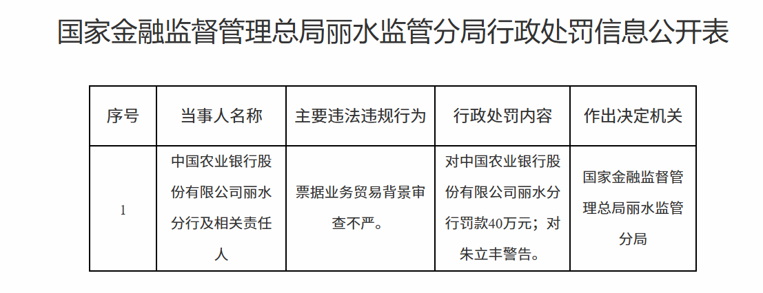 1月8日,国家金融监督管理总局丽水监管分局行政处罚信息公开表显示,中国农业银行股份有限公司丽水分行因票据业务贸易背景审查不严被款40万元;责任人朱某丰被警告。